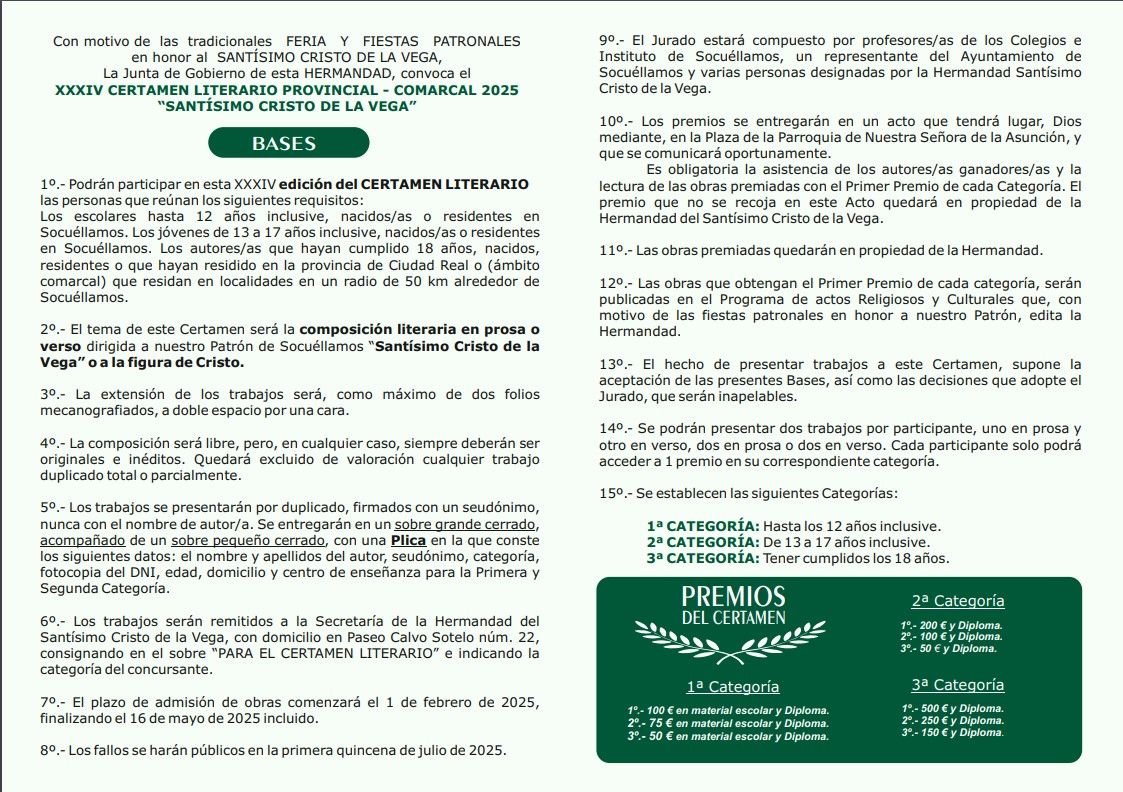 La Hermandad del Santísimo Cristo de la Vega de Socuéllamos ha anunciado la convocatoria del XXXIV Certamen Literario Provincial-Comarcal 2025, que estará abierto para recibir obras desde el 1 de febrero hasta el 16 de mayo de 2025. El tema del certamen es la composición literaria en prosa o verso dedicada al Santísimo Cristo de la Vega o a la figura de Cristo.
