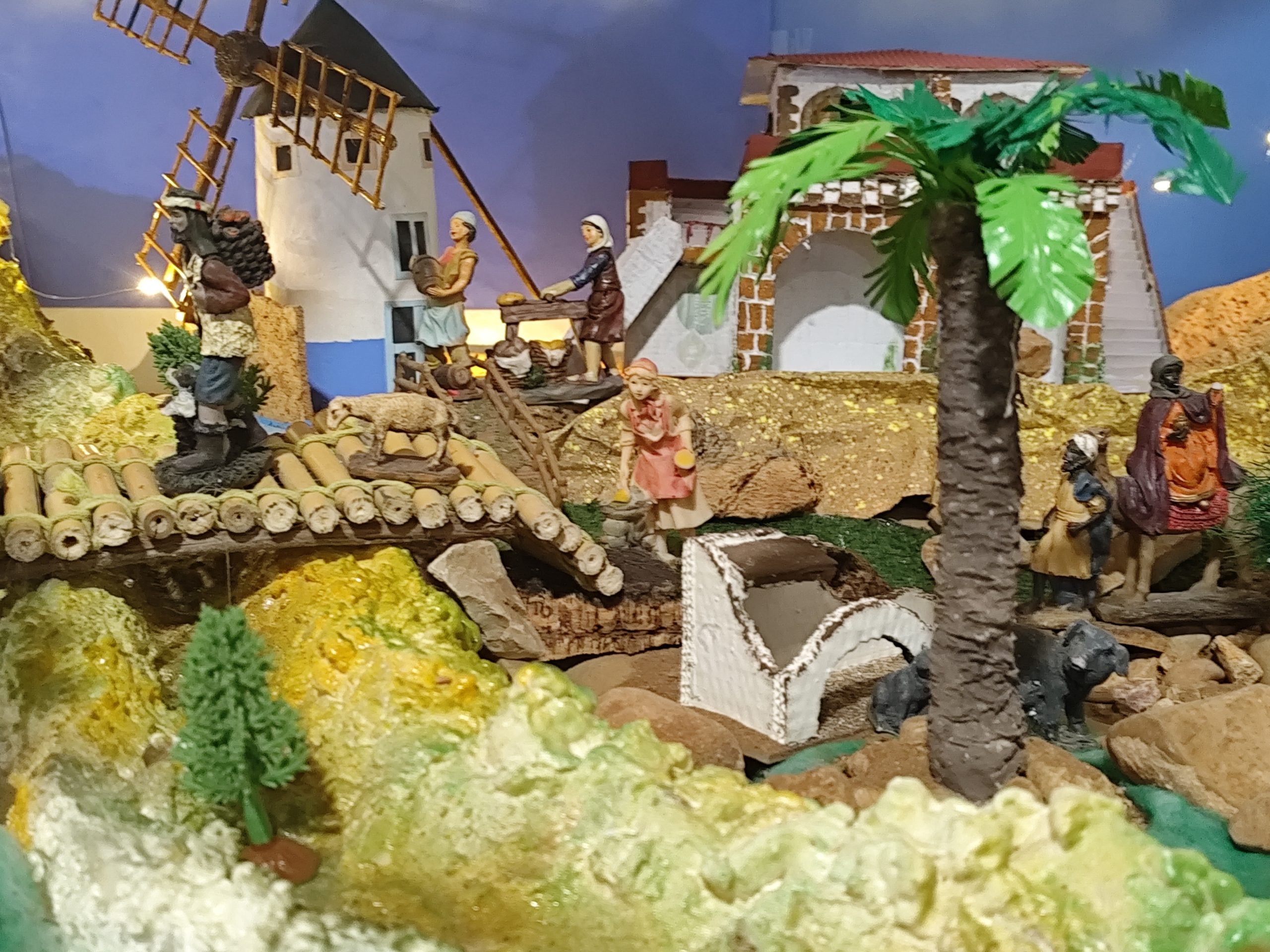 El belén cuenta con elementos que lo hacen especial, como un río con agua corriente, gracias a una bomba cuidadosamente instalada, y un sistema de iluminación propia que resalta cada rincón del paisaje, aportando realismo y magia al conjunto.