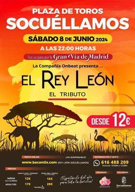 La compañía Onbeat presenta en Socuéllamos el musical Tributo al Rey León. El Rey León es una de las obras musicales más reconocidas a nivel mundial, con más de 3.500 representaciones y más de cinco millones de espectadores, el musical El Rey León es todo un clásico en la Gran Vía madrileña.