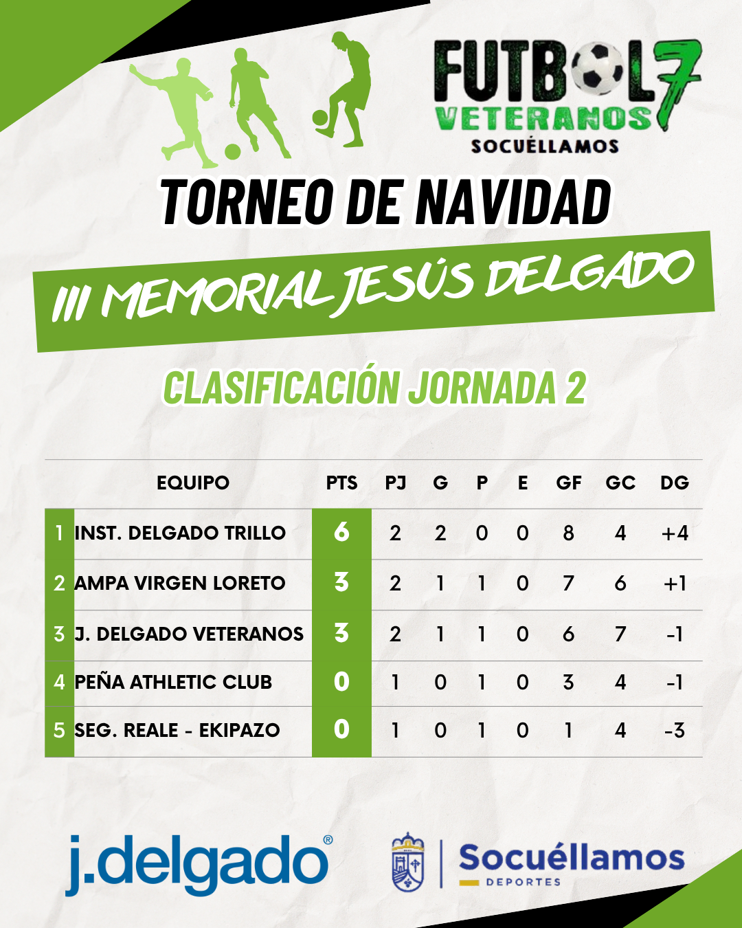 Tras la disputa de esta segunda jornada, la clasificación la encabeza el Inst. Delgado Trillo (6 puntos), seguido del AMPA Virgen Loreto (3) y J. Delgado Veteranos (3). Cierran la tabla la Peña Athletic Club y Seguros Reale–Ekipazo, ambos sin puntuar.