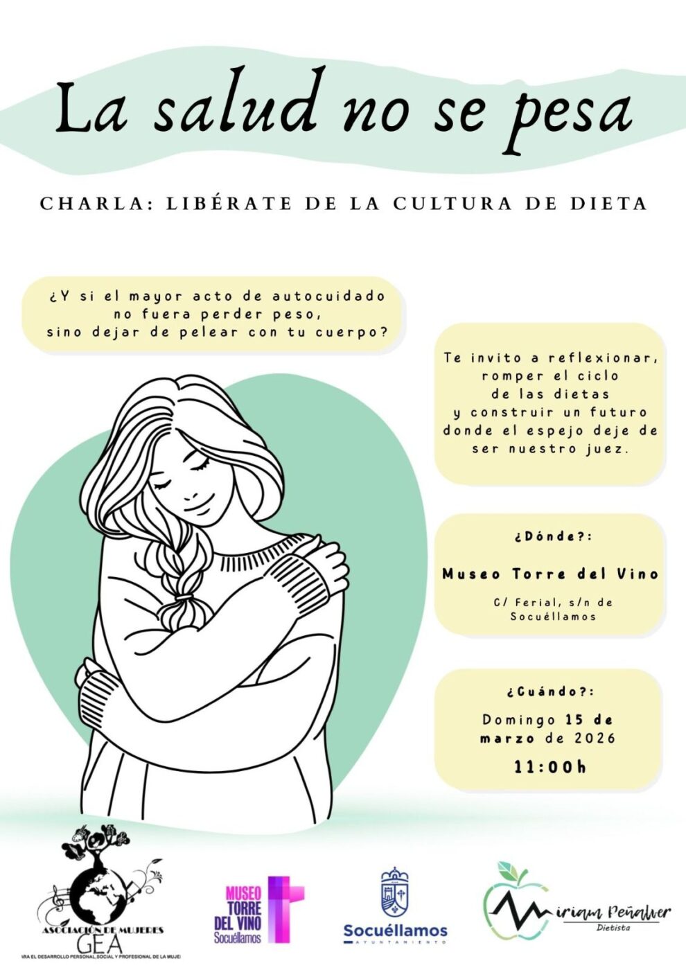 La Asociación de Mujeres GEA ha organizado en Socuéllamos la charla titulada “La salud no se pesa: libérate de la cultura de dieta”, una actividad que se celebrará el próximo domingo 15 de marzo a las 11:00 horas en el Museo Torre del Vino.