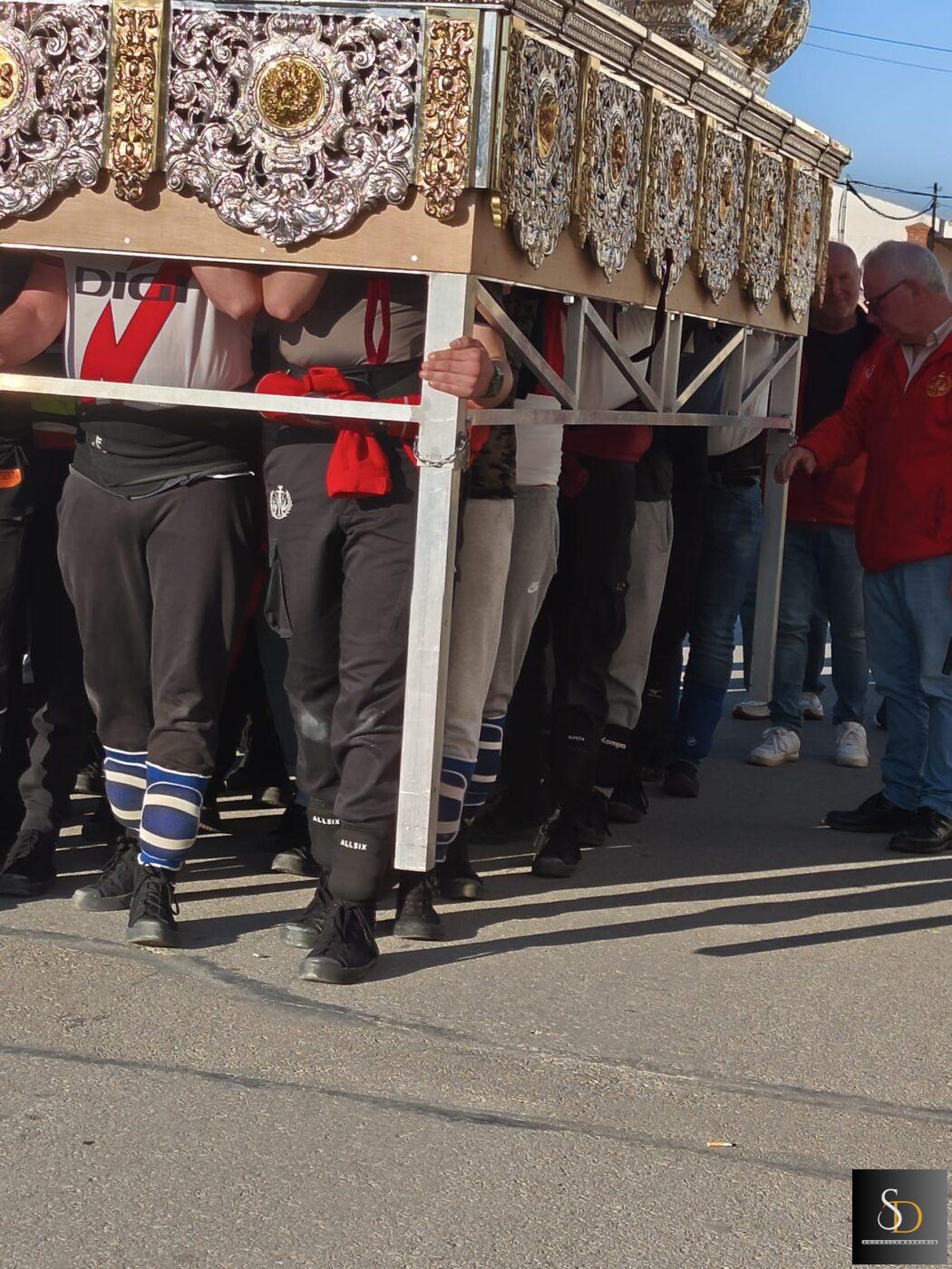 Durante el recorrido, los pasos han realizado una parada especial al pasar por la vivienda de uno de los hermanos, Francisco Del Amo, en un gesto cargado de significado y cercanía dentro de la hermandad.