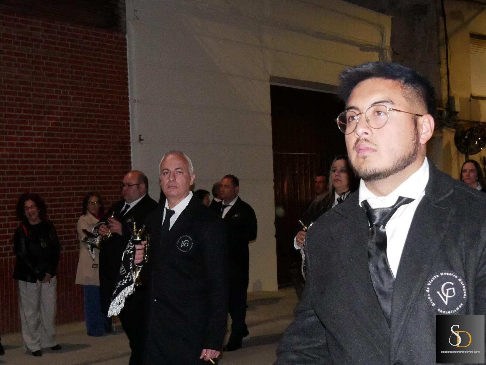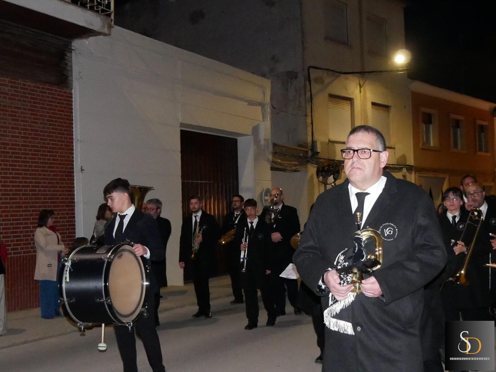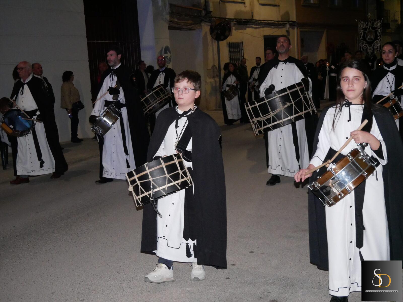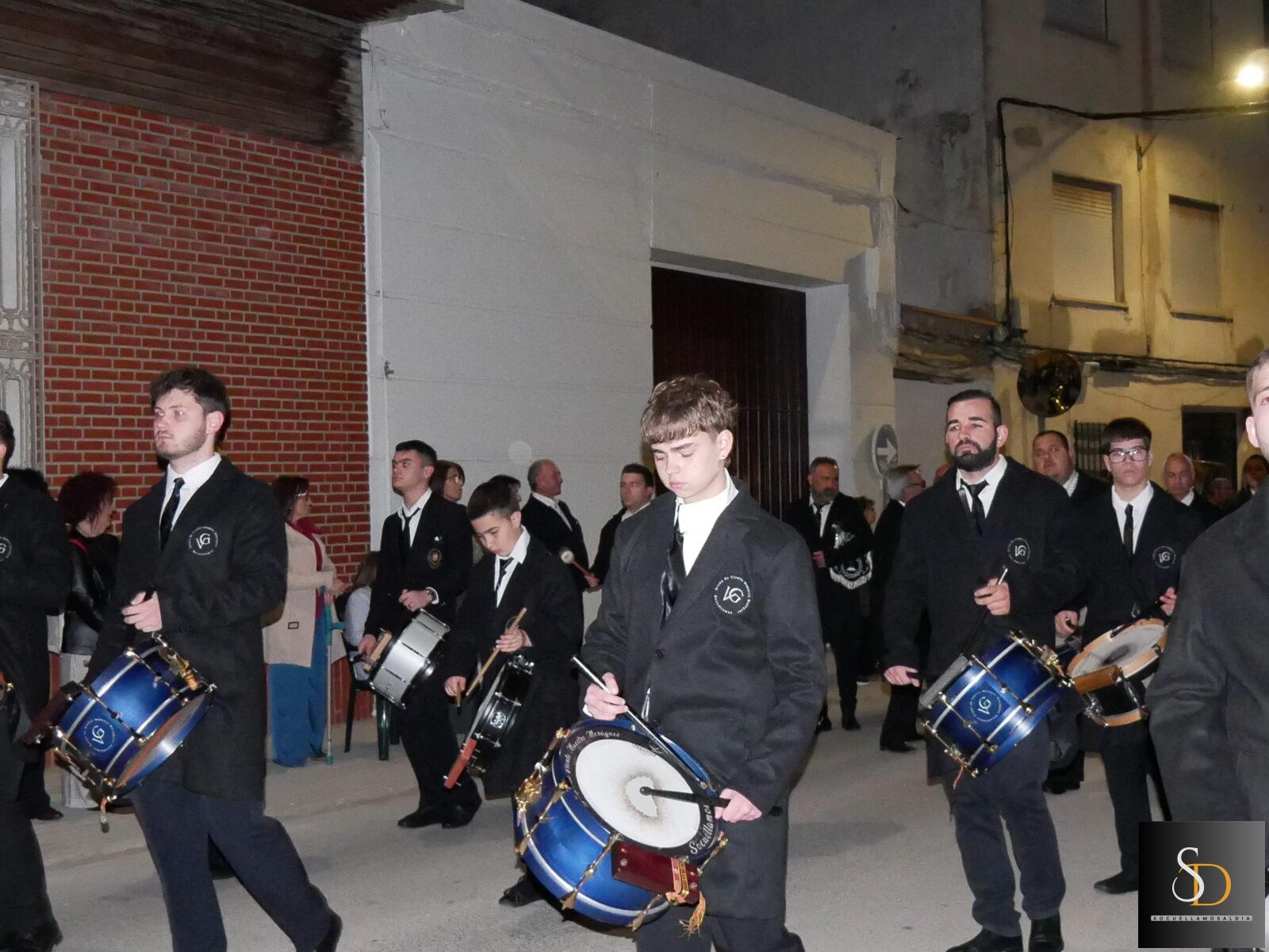 La procesión ha contado con una destacada participación de nazarenos, que han acompañado a la imagen de la Virgen en una noche marcada por el recogimiento y la sobriedad de un Sábado Santo. En el apartado musical, el desfile ha estado acompañado por la Asociación Cultural Tambores de la Piedad y el Grupo de Viento Maestro Moragues, que han contribuido a realzar el carácter solemne del recorrido.