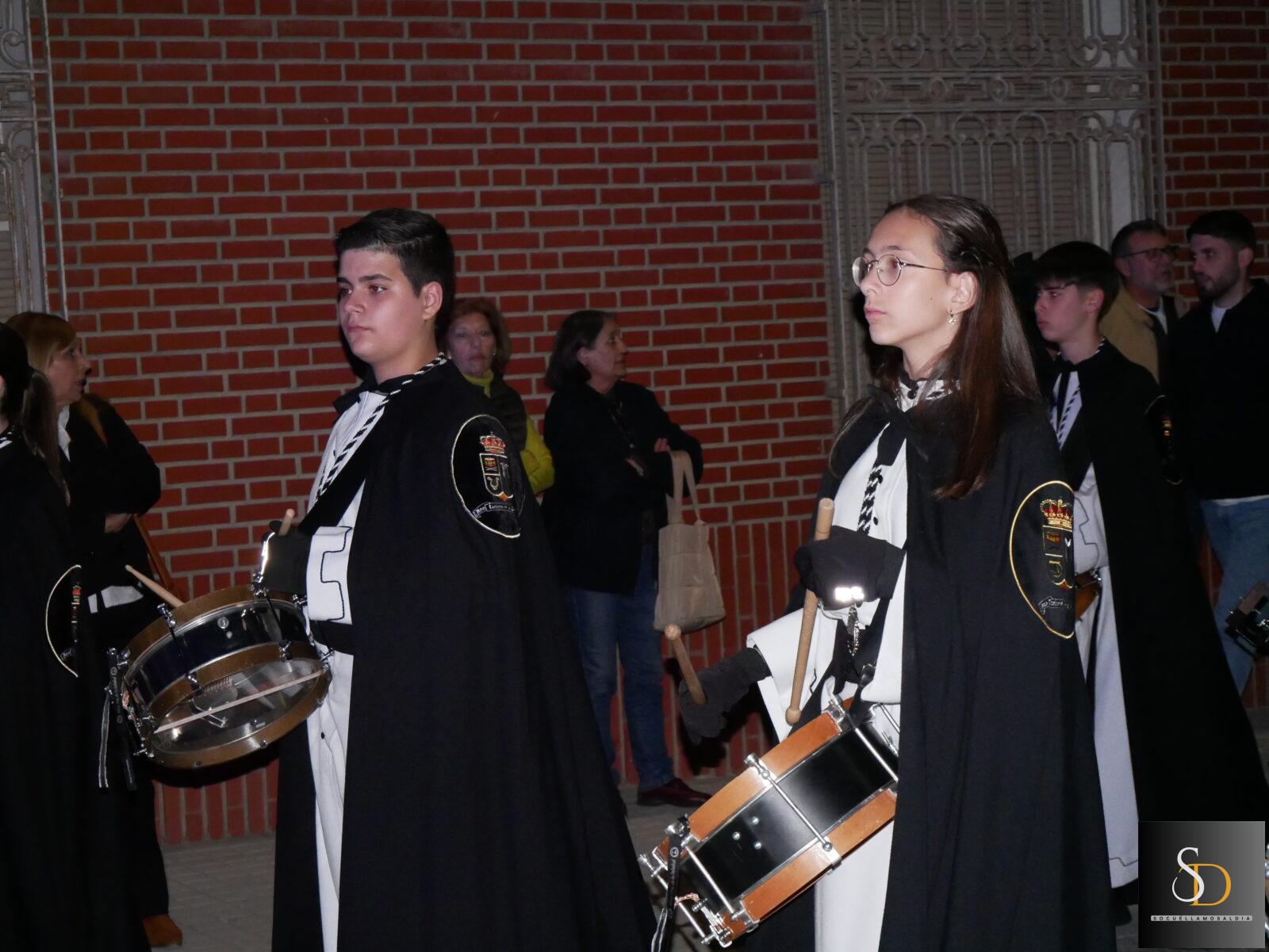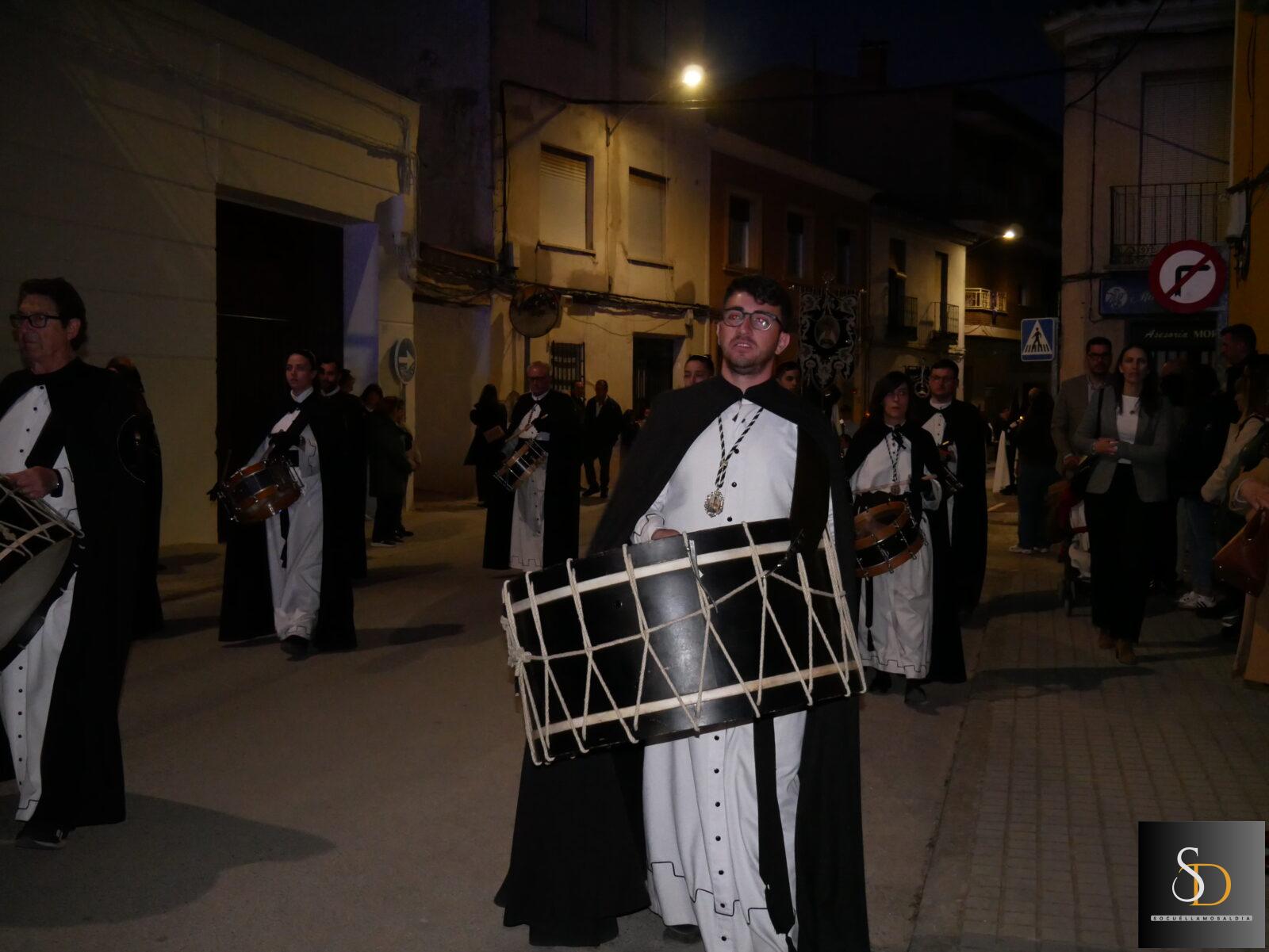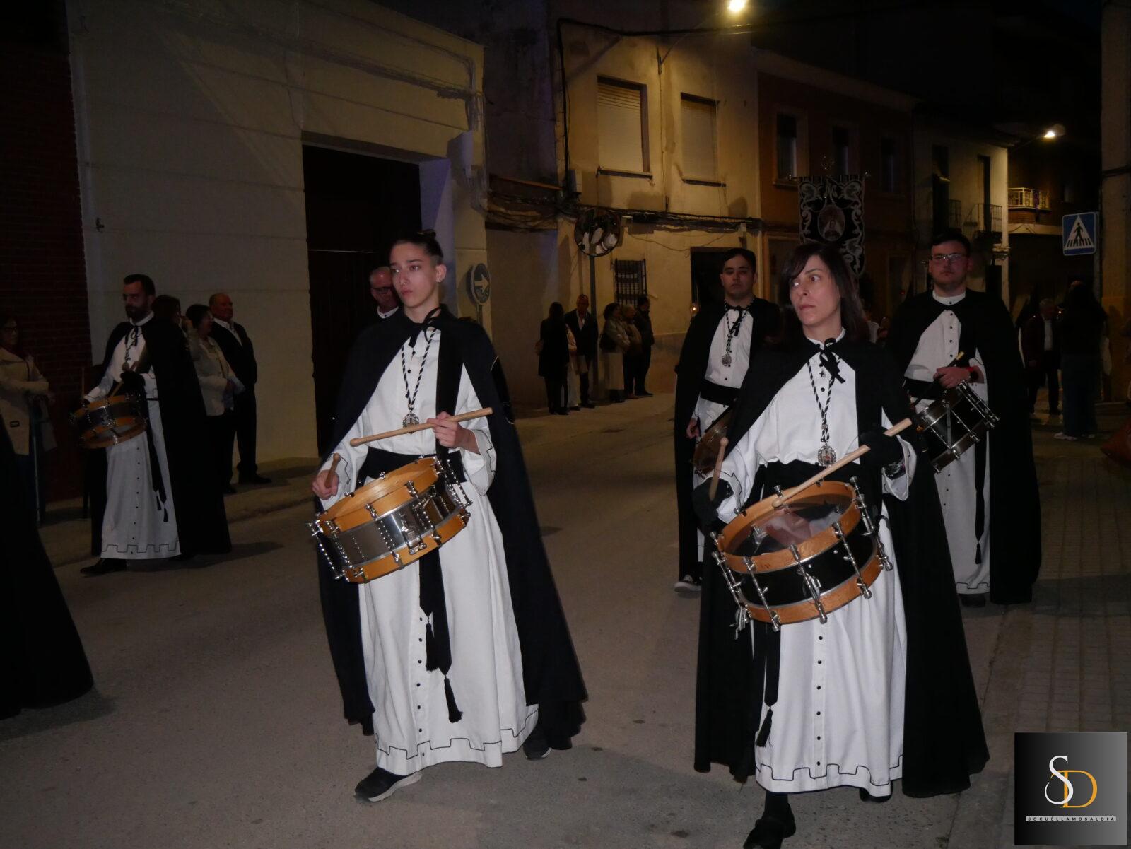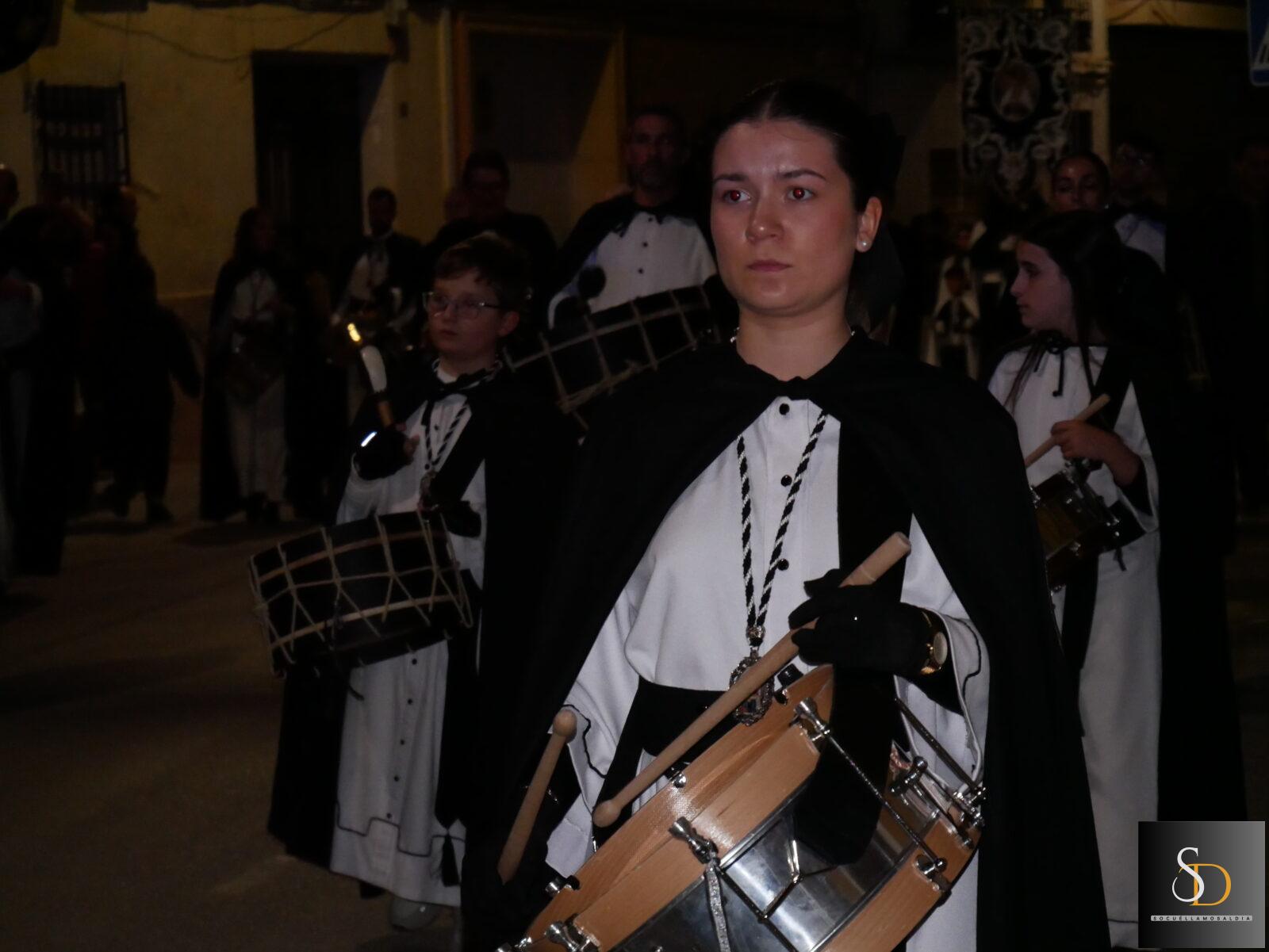 La procesión ha contado con una destacada participación de nazarenos, que han acompañado a la imagen de la Virgen en una noche marcada por el recogimiento y la sobriedad de un Sábado Santo. En el apartado musical, el desfile ha estado acompañado por la Asociación Cultural Tambores de la Piedad y el Grupo de Viento Maestro Moragues, que han contribuido a realzar el carácter solemne del recorrido.