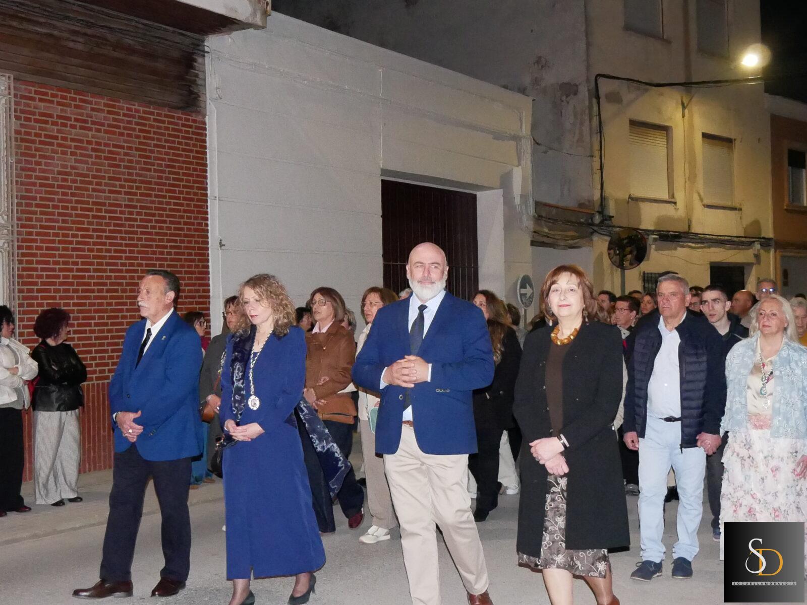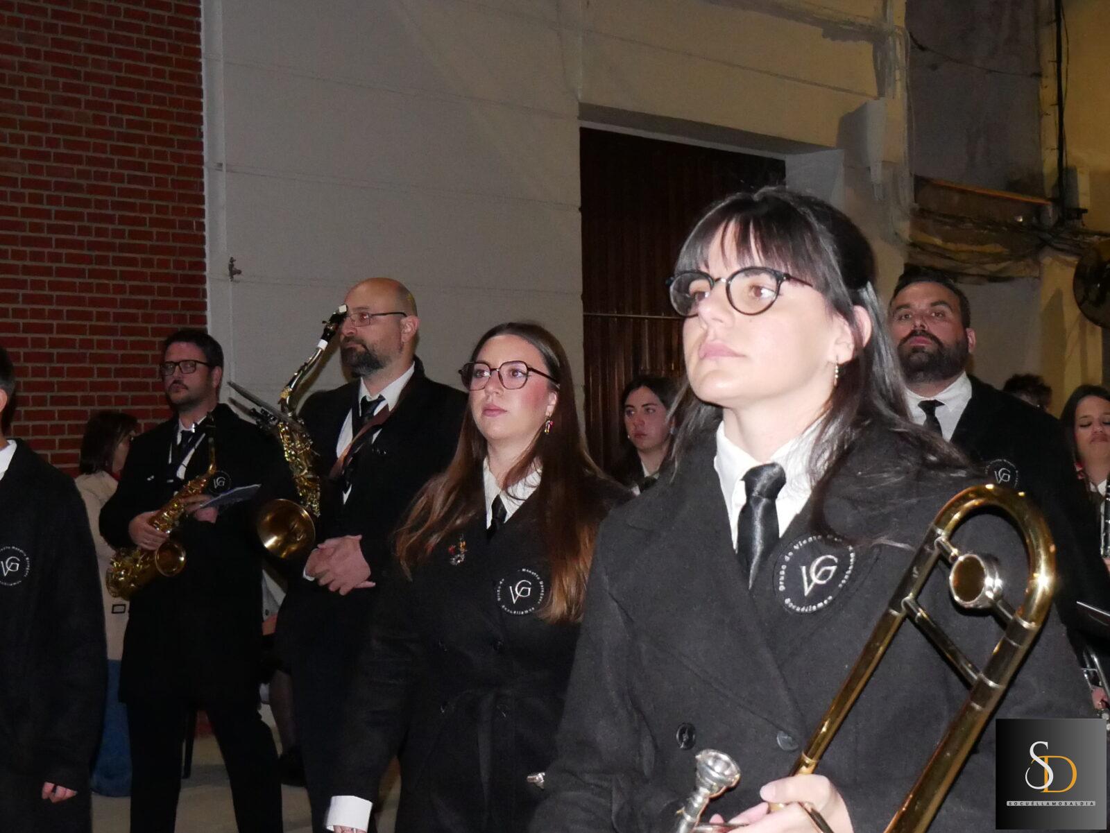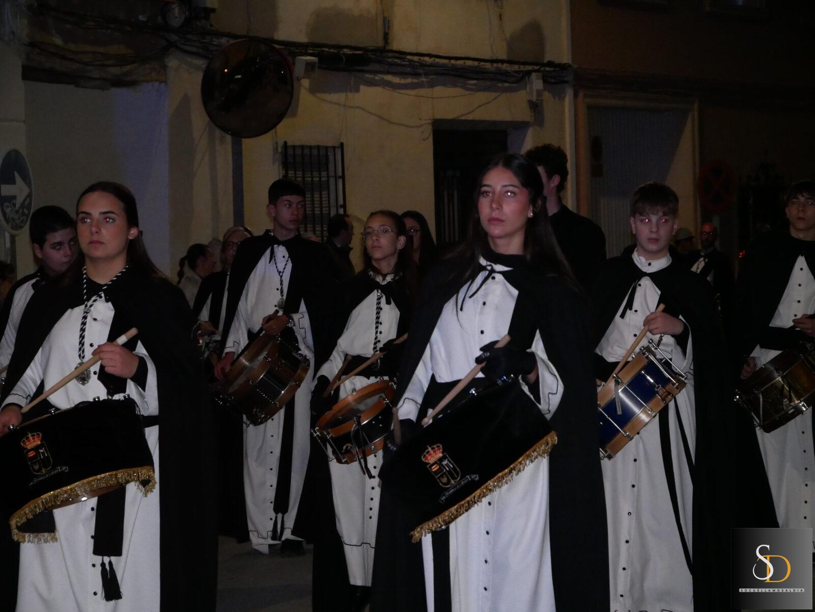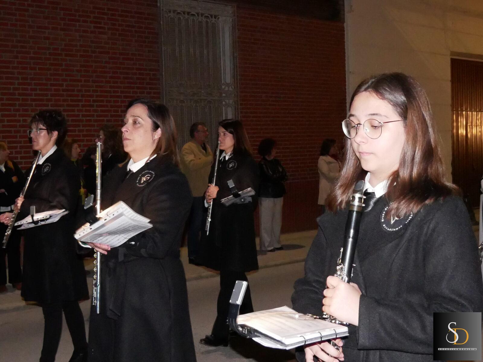 La procesión ha contado con una destacada participación de nazarenos, que han acompañado a la imagen de la Virgen en una noche marcada por el recogimiento y la sobriedad de un Sábado Santo. En el apartado musical, el desfile ha estado acompañado por la Asociación Cultural Tambores de la Piedad y el Grupo de Viento Maestro Moragues, que han contribuido a realzar el carácter solemne del recorrido.