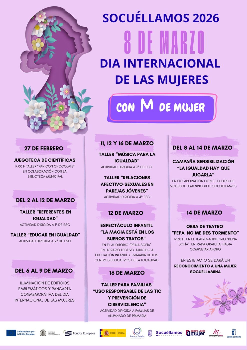 La programación se cerrará el 14 de marzo con la obra de teatro “Pepa, no me des tormento”, que se representará a las 19:30 horas en el Teatro-Auditorio Reina Sofía, con entrada gratuita hasta completar aforo. Durante este acto se realizará también un reconocimiento a una mujer socuellamina. Finalmente, el 16 de marzo se impartirá el taller para familias “Uso responsable de las TIC y prevención de la ciberviolencia”, dirigido a familias del alumnado de Primaria.